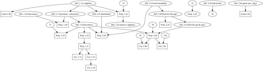 | Keywords: Grafo mostrando dependência entre definições e resultados de Medida.svg Medida e integração feita com o http //www graphviz org/License php Graphviz Trata-se de um grafo ilustrando a dependência entre conceitos e resultados da Teoria da Medida Um conceito ou resultado é usado em outro se houver um caminho uma sequência de setas de mesma orientação ligando o primeiro ao segundo own Helder 10/02/2010 Código fonte digraph G / Mensurabilidade http //pt wikibooks org/w/index php oldid 137444 / Def 1 1 s-algebra -> Def 1 7 esp mens conj mens ; Def 1 7 esp mens conj mens -> Def 1 9 fun mens ; Prop 1 10 shape box; Def 1 9 fun mens -> Prop 1 10 ; Prop 1 11 shape box; Prop 1 10 -> Prop 1 11 ; Cor 1 12 shape box; Prop 1 11 -> Cor 1 12 ; Cor 1 13 shape box; Prop 1 11 -> Cor 1 13 ; Cor 1 14 shape box; Cor 1 13 -> Cor 1 14 ; Prop 1 18 shape box; Def 1 16 fun carac -> Prop 1 18 ; Def 1 7 esp mens conj mens -> Prop 1 18 ; Prop 1 19 shape box; Def 1 9 fun mens -> Prop 1 19 ; 1 -> Prop 1 19 ; Lema 1 20 shape box; Def 1 1 s-algebra -> Lema 1 20 2 -> Prop 1 20 ; Prop 1 21 shape box; Def 1 1 s-algebra -> Prop 1 21 3 -> Prop 1 21 Prop 1 21 -> Def 1 22 menor s-algebra / A reta real estendida http //pt wikibooks org/w/index php oldid 138910 / Def 2 23 reta estendida -> Def 2 30 lim inf lim sup ; Def 1 1 s-algebra -> Def 2 25 boreliano ; Def 2 26 fun borel -> 6 ; Prop 2 29 shape box; Def 1 9 fun mens -> Prop 2 29 ; Def 2 23 reta estendida -> Prop 2 29 ; Def 2 25 boreliano -> Prop 2 29 ; Prop 2 31 shape box; Def 2 30 lim inf lim sup -> Prop 2 31 ; Def 2 30 lim inf lim sup -> Def 2 33 lim inf sup de seq Prop 2 39 shape box; Def 1 9 fun mens -> Prop 2 39 ; Def 2 33 lim inf sup de seq -> Prop 2 39 ; 8 -> Prop 2 39 ; Cor 2 40 shape box; Prop 2 39 -> Cor 2 40 ; 9 -> Cor 2 40 ; Cor 2 41 shape box; Prop 2 39 -> Cor 2 41 ; 10 -> Cor 2 41 ; Lema 2 45 shape box; Def 2 42 parte pos neg -> Lema 2 45 Measure theory Graphs graph theory |