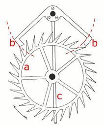 | Keywords: Graham Escapement.png Graham_Escapement svg Drawing of a Graham or deadbeat clock escapement Invented by astronomer Richard Towneley in 1675 and first widely used by British clockmaker George Graham in his precision regulators around 1715 the deadbeat escapement was a more accurate version of the anchor escapement In the 19th century it replaced the anchor escapement as the standard escapement in quality pendulum clocks and is used in almost all modern pendulum clocks Alterations Removed captions and labels replaced labels in color added dotted lines moved arrow from top of wheel to side drew in pendulum crutch Labeled parts a escape wheel b pallets showing concentric locking faces c pendulum crutch Downloaded from http //books google com/books id 5SYJAAAAIAAJ pg PA108 Frederick J Britten 1896 Watch and Clock Maker's Handbook 9th Edition E F N Spon London p 108 on Google Books Published 1896 Frederick J Britten Public domain - author died in 1913 PD-old Graham Escapement |