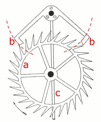 Keywords: Graham Escapement.png Graham_Escapement svg Drawing of a Graham or deadbeat clock escapement Invented by astronomer Richard Towneley in 1675 and first widely used by British clockmaker George Graham in his precision regulators around 1715 the deadbeat escapement was a more accurate version of the anchor escapement In the 19th century it replaced the anchor escapement as the standard escapement in quality pendulum clocks and is used in almost all modern pendulum clocks Alterations Removed captions and labels replaced labels in color added dotted lines moved arrow from top of wheel to side drew in pendulum crutch Labeled parts a escape wheel b pallets showing concentric locking faces c pendulum crutch Downloaded from http //books google com/books id 5SYJAAAAIAAJ pg PA108 Frederick J Britten 1896 Watch and Clock Maker's Handbook 9th Edition E F N Spon London p 108 on Google Books Published 1896 Frederick J Britten Public domain - author died in 1913 PD-old Graham Escapement |