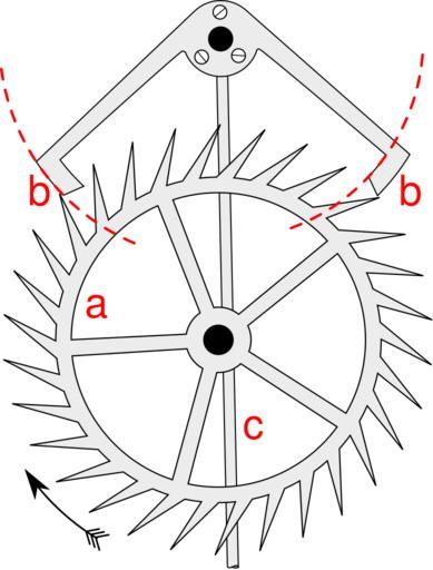 | Keywords: Graham Escapement.svg Drawing of a Graham or deadbeat clock escapement Alterations Removed captions and labels replaced labels in color added dotted lines moved arrow from top of wheel to side drew in pendulum crutch Labeled parts a escape wheel b pallets showing concentric locking faces c pendulum crutch Graham_Escapement png 2010-01-08 22 49 UTC Graham_Escapement png Frederick J Britten derivative work McSush <span class signature-talk >talk</span> redrawn as svg image McSush Graham_Escapement png Inkscape-hand PD-old original upload log This image is a derivative work of the following images File Graham_Escapement png licensed with PD-old 2007-11-01T07 13 25Z Chetvorno 853x1031 29252 Bytes <nowiki> Summary Drawing of a Graham or deadbeat clock escapement Alterations Removed captions and labels replaced labels in color moved arrow from top of wheel to side drew in pendulum rod O</nowiki> 2007-11-01T07 06 59Z Chetvorno 853x1031 29262 Bytes <nowiki> Summary Drawing of a Graham or deadbeat clock escapement Alterations Removed captions and labels replaced labels in color moved arrow from top of wheel to side drew in pendulum rod O</nowiki> 2007-10-23T18 59 40Z Chetvorno 853x1031 28579 Bytes <nowiki> Summary Drawing of a Graham or deadbeat clock escapement Alterations Removed captions and labels replaced labels in color moved arrow from top of wheel to side drew in pendulum rod Or</nowiki> 2007-10-23T18 45 51Z Chetvorno 853x1031 28558 Bytes <nowiki> Drawing of a deadbeat or Graham clock escapement Alterations Removed captions and labels replaced labels in color drew in pendulum rod cropped out white space Parts a escape wheel b pal</nowiki> Uploaded with derivativeFX Graham Escapement |
