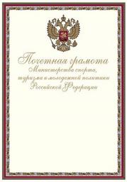 | Keywords: Gram mstm.jpg ru Почётная г амота инисте ства спо та ту изма и молодёжной политики Российской феде ации 2016-01-18 Скан о игинального бланка Snekot other versions Custom license marker 2016 01 18 PD-RU-exempt Awards associated with sports of Russia |