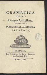 | Keywords: Gramática de la lengua castellana RAE 1771.jpg es Gramática de la lengua castellana / compuesta por la Real Academia Española-- Madrid por D Joachin Ibarra 1771 14 XXII 376 p ; 8º Signatura R/38876 1771 http //bdh bne es/bnesearch/detalle/bdh0000063358 - Biblioteca Digital Hispánica Biblioteca Nacional de España Real Academia Española other versions BNE PD-old-100 Uploaded with UploadWizard Real Academia Española Title pages from Spain Books from Spain Spanish language Books published in Madrid |