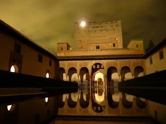 Keywords: granada spain building architecture columns night evening pond water reflections beautiful outside