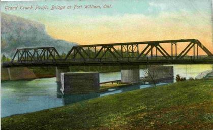 | Keywords: fort william fortwilliam postcard bridges grand trunk railway grandtrunkrailway grand trunk pacific bridge grandtrunkpacificbridge thunder bay thunderbay fort william indian band fortwilliamindianband james street jamesstreet roman catholic church romancatholicchurch ontario canada history bridge architecture outdoor trestle steel arch bridge truss building building structure Date: c. 1908 Description: After the Post Office approved the mailing of illustrated postcards in 1897, many hand-coloured images of the city were produced, purchased, and mailed to friends and loved ones. This postcard depicts the Grand Trunk Pacific Bridge located on James Street in Fort William, ON. After talks with the Fort William Indian Band, the Roman Catholic Church, and the Town of Fort William, the company began construction on the bridge in September 1907 and the first train crossed it a year later. The bridge is 258 feet long. Initially it had to be opened by hand, a big job, requiring a gang of men to turn the cranks. A $50,000 bonus granted by the taxpayers of Fort William to help pay for the bridge guaranteed the City a perpetual right to use the bridge for traffic, free of charge. Accession No.:983.70.12 Date: c. 1908 Description: After the Post Office approved the mailing of illustrated postcards in 1897, many hand-coloured images of the city were produced, purchased, and mailed to friends and loved ones. This postcard depicts the Grand Trunk Pacific Bridge located on James Street in Fort William, ON. After talks with the Fort William Indian Band, the Roman Catholic Church, and the Town of Fort William, the company began construction on the bridge in September 1907 and the first train crossed it a year later. The bridge is 258 feet long. Initially it had to be opened by hand, a big job, requiring a gang of men to turn the cranks. A $50,000 bonus granted by the taxpayers of Fort William to help pay for the bridge guaranteed the City a perpetual right to use the bridge for traffic, free of charge. Accession No.:983.70.12 |