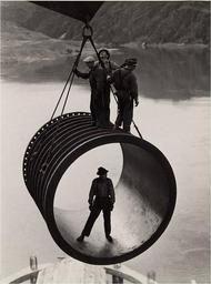 | Keywords: GrandCouleeDamWorkersPenstock.jpg en Four men three standing on top and one standing inside riding on large casing section of pipe suspended by cable as it is moved into position by a crane reservoir in the background during construction of the Grand Coulee Dam Washington http //www loc gov/pictures/item/2008676662/ LOC-image ppmsca 17400 pnp United States Bureau of Reclamation between 1936 1946 PD-USGov Construction of the Grand Coulee Dam | ||||
