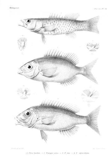 | Keywords: GrandidierMadagascarFishes 0053.jpg Pikea lunulata Pentapus curtus Pentapus dux Pentapus aureovittatus Histoire Physique Naturelle et Politique de Madagascar Volume 16 Histoire Naturelle des Poissons atlas http //www archive org/details/histoirephysique16gran web 1885 text Alfred Grandidier 1836-1921 artists various Arnoul pd-old-70 Alfred Grandidier Histoire Physique Naturelle et Politique de Madagascar - Grandidier - Volume 16 Poissons | ||||