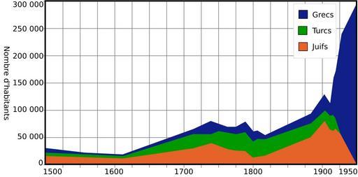 | Keywords: Graphe salonique.svg Evolution de la population de Salonique rapportée à ses trois principales communautés Juive Turque et Grecque 1500-1950 Own work inspired from Régis Darques Salonique au XXe siècle de la cité ottomane à la métropole grecque CNRS éditions Paris 2000 ISBN 9782271056603 p 62 2007 User Kimdime69 Demographics of Thessaloniki Judaism in Thessaloniki Turks in Greece Temporal population graphs of Greece | ||||