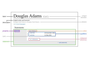 | Keywords: Graphic representing the datamodel in Wikidata.svg en Graphic representing the datamodel in Wikidata with a collapsed reference 2016-06-21 own Charlie Kritschmar WMDE other versions cc-zero Graphics Wikidata information materials Wikidata Wikidata visualizations |
