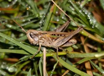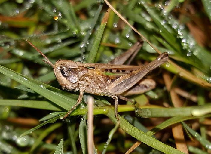 Keywords: grasshopper slant faced grasshopper hopper insect close up dew rain wet droplets water droplets small grass wildlife fauna nature bokeh insectoid arthropod mermiria bivittata