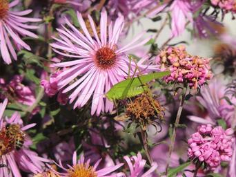 Keywords: grasshopper viridissima green insect flower flowers purple
