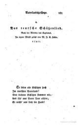 | Keywords: Gräter Das teutsche Schützenlied 1.png Das teutsche Schützenlied in Friedrich David Gräter Lyrische Gedichte nebst einigen vermischten Heidelberg 1809 S 183 http //books google com/books id mFxJAAAAYAAJ pg PA183 1797/1809 Friedrich David Gräter <gallery> File Gräter Das teutsche Schützenlied 1 png Datei 1 S 183 File Gräter Das teutsche Schützenlied 2 png Datei 2 S 184 File Gräter Das teutsche Schützenlied 3 png Datei 3 S 185 </gallery> PD-old-100 De Wikisource book | ||||