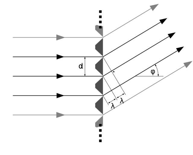 | Keywords: Grating condition.svg en Deriving the grating condition; at perpendicular incidence α+φ 90° inside the right-angled triangle the other angle is equal to 90°-α φ constructive interference occurs when sin φ is equal to the wavelength divided by the distance between the rulings or more generally when <math>\sin \varphi \dfrac n\lambda d n \in \Z </math> File Beugungsgitter sl svg File Beugungsgitter svg Pieter Kuiper Biezl 2012-03-22 Transmission gratings | ||||