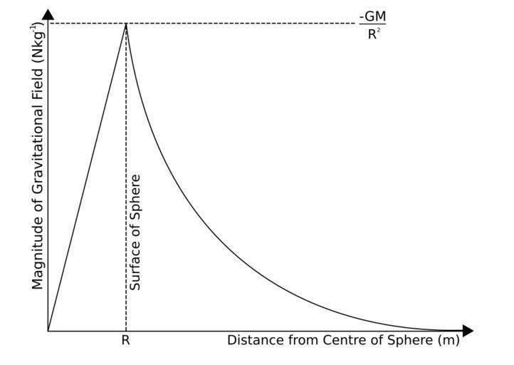 Keywords: Grav field sphere.svg en Graph of gravitational field around and inside a spherical mass against distance from the centre of the mass Own Sjlegg 2009-04-23 Gravitation