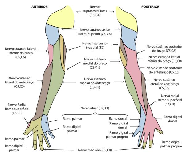 | Keywords: Gray812and814 - PT.svg en The cutaneous innervation of the right upper limb Both areas supplied by the medial brachial cutaneous nerve are colored green The areas supplied by branches of the radial nerve are colored pink pt A inervação cutânea do membro superior direito Ambas as áreas supridas pelo nervo cutâneo medial são de cor verde As áreas fornecidas pelos ramos do nervo radial são de cor-de-rosa 2016-10-19 https //commons wikimedia org/wiki/File Gray812and814 svg Henry Gray 1918 Anatomy of the Human Body Olhar seção Livro no link da Fonte Bartleby com http //www bartleby com/107/ Gray's Anatomy http //www bartleby com/107/illus812 html Plate 812 derivative work Ederporto other versions <gallery> File Gray812and814 svg language en </gallery> cc-zero Gray's Anatomy plates SVG Gray's Anatomy plates Limbs SVG human nerves Sensory system NeuroMat images |