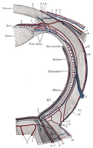 | Keywords: Gray877.png en Gray's Anatomy plate Diagram of the blood vessels of the eye as seen in a horizontal section Leber after Stöhr <br> Course of vasa centralia retinæ a Arteria; a<sub>1</sub> Vena centralis retinæ; B Anastomosis with vessels of outer coats; C Anastomosis with branches of short posterior ciliary arteries; D Anastomosis with chorioideal vessels <br> Course of vasa ciliar postic brev I Arteriæ and I<sub>1</sub> Venæ ciliar postic brev ; II Episcleral artery; II<sub>1</sub> Episcleral vein; III Capillaries of lamina choriocapillaris <br> Course of vasa ciliar postic long 1 a ciliar post longa; 2 Circulus iridis major cut across; 3 Branches to ciliary body; 4 Branches to iris <br> Course of vasa ciliar ant a Arteria a1 Vena ciliar ant ; b Junction with the circulus iridis major; c Junction with lamina choriocapill; d Arterial and d<sub>1</sub> Venous episcleral branches; e Arterial and e<sub>1</sub> Venous branches to conjunctiva scleræ; f Arterial and f<sub>1</sub> Venous branches to corneal border V Vena vorticos; S Transverse section of sinus venosus scleræ Other fields 1 Information field Ucfirst Plate 877 before 1858 Henry Gray Anatomy of the Human Body See Book section below 877 Creator Henry Vandyke Carter File Gray877 rotated jpg Book Gray's Anatomy PD-old-100-1923 Gray's Anatomy plates 0877 |