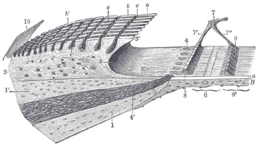 Keywords: Gray930.png This drawing is originally from Leo Testut 1897 D'Anatomie Humane vol 2 p 1157 fig 909 It does not appear in the 1901 15th ed of Gray's but came in sometime later Testut died in 1925 so it's more than 75 years past the death of the creator so it should be public domain everywhere I can upload a high-res scan if anyone wants it Limbus laminæ spiralis and membrana basilaris Schematic 1 1 ™ Upper and lower lamellæ of the lamina spiralis ossea 2 Limbus laminæ spiralis with a the teeth of the first row; b b ™ the auditory teeth of the other rows; c c ™ the interdental grooves and the cells which are lodged in them 3 Sulcus spiralis internus with 3 ™ its labium vestibulare and 3 its labium tympanicum 4 Foramina nervosa giving passage to the nerves from the ganglion spirale or ganglion of Corti 5 Vas spirale 6 Zona arcuata and 6 ™ zona pectinata of the basilar membrane with a its hyaline layer B its connective-tissue layer 7 Arch of spiral organ with 7 ™ its inner rod and 7 its outer rod 8 Feet of the internal rods from which the cells are removed 9 Feet of the external rods 10 Vestibular membrane at its origin Testut Other fields 1 Information field Ucfirst Plate 930 before 1858 Henry Gray Anatomy of the Human Body See Book section below 930 Creator Henry Vandyke Carter Book Gray's Anatomy PD-old-100-1923 Gray's Anatomy plates 0930 Sensory Neuroscience Hearing and speech Anatomical plates and drawings of the human ears Organ of Corti Spiral ganglion |