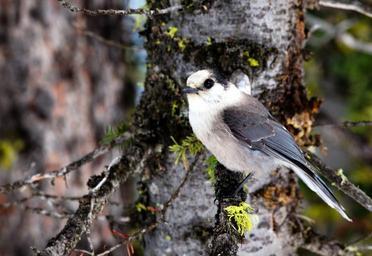 Keywords: gray jay bird tree branch perch nature outside macro close-up