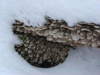 View Original:Gray shelf mushrooms on log in snow.jpg (2592x1944)
