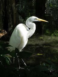 Keywords: great egret waterfowl bird large heron wetlands all white plumage casmerodius albus enclosure zoo portrait looking standing