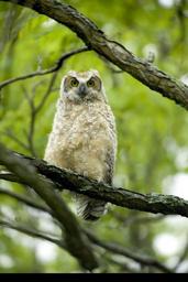 Keywords: great horned owl baby bird wildlife nature perched beak predator raptor nocturnal outdoors hunter looking