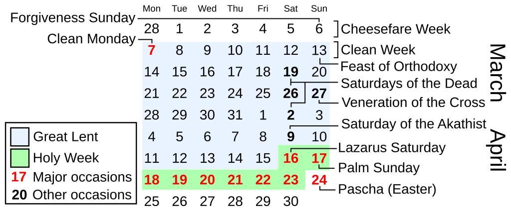 | Keywords: Great Lent in March-April 2011.svg en Shows Great Lent in March/April of 2011 as observed in Eastern denominations along with many of the named days In Eastern denominations Lent covers the days marked with a blue background from Clean Monday through the Friday before Lazarus Saturday For Western denominations see File Lent in March-April 2011 svg Based on File 2011 calendar svg User Dcoetzee Nevit Dilmen <span class signature-talk >talk</span> 2012-08-02 <gallery> File 2011 calendar svg </gallery> Lent fasting period Cc-zero |