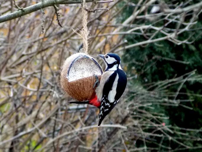 Keywords: great spotted woodpecker woodpecker bird nature forest animal garden colorful spring dress feather wing schnabelm bird feeding stuffed coconut feeding