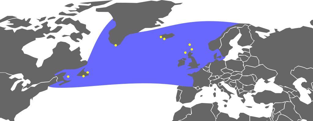 Keywords: GreatAukMap.svg en Distribution limit marked in blue and yellow spots indicate known breeding sites of the now extinct Great Auk Based on map in Symington Grieves 1855 map in his book on the Great Auk own Shyamal 2010 Pinguinus impennis Charadriiformes distribution maps Extinct aves distribution maps |