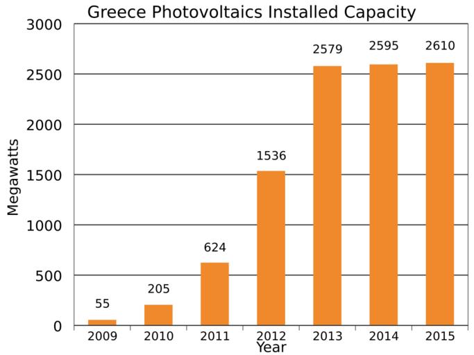 | Keywords: Greece Photovoltaics Installed Capacity.svg translate yes en Installed photovoltaics in Greece from 2009 to 2015 Source http //www iea-pvps org/fileadmin/dam/public/report/PICS/IEA-PVPS_-__A_Snapshot_of_Global_PV_-_1992-2015_-_Final_2_02 pdf IEA-PVPS 2014-12-10 own Delphi234 other versions cc-zero Solar energy in Greece Photovoltaic power statistics |