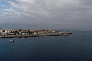 Keywords: greece rhodes castle city homes fortress city gate goal wall tower port sea water sky architecture coast harbour entrance