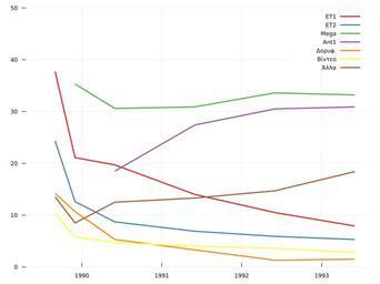 | Keywords: Greece-tv-viewings-early-90s.svg en Ratings for major Greek television channels from early 90s Source cite book Πα αθανασό ουλος Στέλιος Η τηλεόραση στον κόσμο 1994 Εκδόσεις Πα αζήση Αθήνα 270 960-02-1043-8 2015-04-30 own CubicStar other versions cc-zero Created with Gnuplot Gnuplot script to generate this plot <source lang gnuplot > Terminal set terminal svg enhanced size 800 600 font sans set output greece-tv-viewings-early-90s svg Data and formats set datafile missing - set datafile separator whitespace set xdata time set timefmt Y- m set format x Y Scale and ranges set autoscale set xrange 1989-04 1993-08 set yrange 0 50 Ticks borders and title set border 0 set xtics 1989 1989 1990 1991 1992 1993 1994 nomirror set ytics autofreq nomirror set grid xtics linetype 1 linewidth 1 linecolor rgb efefef set grid ytics linetype 1 linewidth 1 linecolor rgb efefef Inline data Note that months are a little by convention data << EOData 1989-09 37 7 24 3 - - 14 2 10 3 13 5 1989-12 21 1 12 6 35 3 - 10 7 5 8 8 5 1990-06 19 7 8 7 30 6 18 5 5 3 4 7 12 5 1991-06 14 0 6 9 30 9 27 4 3 3 4 0 13 3 1992-06 10 5 5 9 33 6 30 5 1 3 3 6 14 7 1993-06 7 9 5 3 33 2 30 9 1 5 2 8 18 4 year et1 et2 mega ant1 sat video other EOData plot data using 1 2 with lines lw 2 5 linecolor rgb e41a1c title ΕΤ1 \ data using 1 3 with lines lw 2 5 linecolor rgb 377eb8 title ΕΤ2 \ data using 1 4 with lines lw 2 5 linecolor rgb 4daf4a title Mega \ data using 1 5 with lines lw 2 5 linecolor rgb 984ea3 title Ant1 \ data using 1 6 with lines lw 2 5 linecolor rgb ff7f00 title Δορυφ \ data using 1 7 with lines lw 2 5 linecolor rgb ffff33 title Βίντεο \ data using 1 8 with lines lw 2 5 linecolor rgb a65628 title Άλλα </source> Television of Greece Uploaded with UploadWizard Gnuplot diagrams |