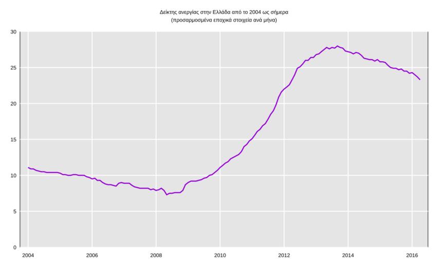 | Keywords: Greece-unemployment-2004-present-el.svg en Unemployment rate in Greece from 2004 to today Data from Hellenic Statistical Authority http //www statistics gr/el/statistics/-/publication/SJO02/- monthly data seasonally adjusted el Δείκτης ανεργίας στην Ελλάδα α ό το 2004 ως σήμερα Δεδομένα α ό την Ελληνική Στατιστική Αρχή ΕΛ ΣΤΑΤ http //www statistics gr/el/statistics/-/publication/SJO02/- ανά μήνα ε οχικά ροσαρμοσμένα 2014-01-03 02 20 53 own CubicStar Source code Graph produced by a Gnuplot script data is inlined for better reproduction <source lang gnuplot > Terminal set terminal svg enhanced size 1000 600 fname Arial sans fsize 12 set output Greece-unemployment-2004-present-el svg Data and formats set datafile missing - set datafile separator set xdata time set timefmt Y- m set format x Y Scale and ranges set autoscale set xrange 2003-10 2016-07 set yrange 0 30 Ticks borders and title set border 0 linewidth 0 set xtics autofreq nomirror set ytics autofreq nomirror set grid xtics back linetype 1 linewidth 3 linecolor rgb ffffff set grid x2tics back linetype 1 linewidth 2 linecolor rgb ffffff set grid ytics back linetype 1 linewidth 3 linecolor rgb ffffff set grid y2tics back linetype 1 linewidth 2 linecolor rgb ffffff set object 1 rectangle \ from graph 0 graph 0 to graph 1 graph 1 \ behind \ fillcolor rgb e5e5e5 \ fillstyle solid 1 0 Title translation Unemployment rate in Greece 2004-today\n Seasonally adjusted data per month set title Δείκτης ανεργίας στην Ελλάδα α ό το 2004 ως σήμερα\n ροσαρμοσμένα ε οχικά στοιχεία ανά μήνα Plot plot - using 1 2 with lines linewidth 2 5 title space-delimited data start month adjusted 2004-01 11 1 2004-02 10 9 2004-03 10 9 2004-04 10 7 2004-05 10 6 2004-06 10 5 2004-07 10 5 2004-08 10 4 2004-09 10 4 2004-10 10 4 2004-11 10 4 2004-12 10 4 2005-01 10 3 2005-02 10 1 2005-03 10 1 2005-04 10 0 2005-05 10 0 2005-06 10 1 2005-07 10 1 2005-08 10 0 2005-09 10 0 2005-10 10 0 2005-11 9 8 2005-12 9 7 2006-01 9 5 2006-02 9 6 2006-03 9 3 2006-04 9 3 2006-05 9 0 2006-06 8 8 2006-07 8 7 2006-08 8 7 2006-09 8 6 2006-10 8 5 2006-11 8 9 2006-12 9 0 2007-01 8 9 2007-02 8 9 2007-03 8 9 2007-04 8 6 2007-05 8 4 2007-06 8 3 2007-07 8 2 2007-08 8 2 2007-09 8 2 2007-10 8 2 2007-11 8 0 2007-12 8 1 2008-01 7 9 2008-02 8 0 2008-03 8 2 2008-04 7 9 2008-05 7 3 2008-06 7 5 2008-07 7 5 2008-08 7 6 2008-09 7 6 2008-10 7 6 2008-11 7 9 2008-12 8 7 2009-01 9 0 2009-02 9 2 2009-03 9 2 2009-04 9 2 2009-05 9 3 2009-06 9 4 2009-07 9 6 2009-08 9 7 2009-09 10 0 2009-10 10 1 2009-11 10 4 2009-12 10 7 2010-01 11 1 2010-02 11 4 2010-03 11 7 2010-04 11 9 2010-05 12 3 2010-06 12 5 2010-07 12 7 2010-08 12 9 2010-09 13 3 2010-10 14 0 2010-11 14 3 2010-12 14 8 2011-01 15 1 2011-02 15 6 2011-03 16 1 2011-04 16 4 2011-05 16 9 2011-06 17 2 2011-07 17 8 2011-08 18 5 2011-09 19 0 2011-10 19 8 2011-11 20 9 2011-12 21 6 2012-01 22 0 2012-02 22 3 2012-03 22 6 2012-04 23 3 2012-05 24 0 2012-06 24 9 2012-07 25 1 2012-08 25 5 2012-09 26 0 2012-10 26 0 2012-11 26 4 2012-12 26 4 2013-01 26 8 2013-02 26 9 2013-03 27 2 2013-04 27 5 2013-05 27 8 2013-06 27 6 2013-07 27 8 2013-08 27 7 2013-09 28 0 2013-10 27 8 2013-11 27 7 2013-12 27 3 2014-01 27 2 2014-02 27 1 2014-03 26 9 2014-04 27 1 2014-05 27 0 2014-06 26 7 2014-07 26 3 2014-08 26 2 2014-09 26 1 2014-10 26 1 2014-11 25 9 2014-12 26 1 2015-01 25 8 2015-02 25 8 2015-03 25 7 2015-04 25 3 2015-05 25 0 2015-06 24 9 2015-07 24 9 2015-08 24 7 2015-09 24 8 2015-10 24 5 2015-11 24 5 2015-12 24 2 2016-01 24 3 2016-02 24 0 2016-03 23 7 2016-04 23 3 data end </source> cc-zero Unemployment in Greece |