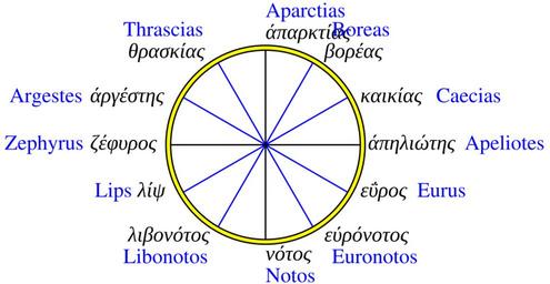 | Keywords: Greek 12-wind rose.svg en Depiction of an ancient Greek 12-wind compass rose following the nomenclature of Timosthenes c 280 BCE as reported by Agathemerus For simplicity this depiction assumes that winds are at 30-degree angles on a compass rose own ElectroKid <small> </small> 2015-01-17 other fields T + v ElectroKid <small> </small> Classical compass winds Cc-zero |