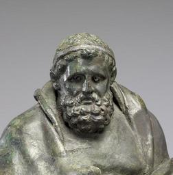 | Keywords: Greek - Aged Herakles - Walters 54764 - Detail A.jpg This bronze statuette depicts a heavy-set Herakles in a rare moment of quiet His shoulders are covered with a lion skin that gathers in a generous fold behind his neck The drooping lion skin is visual contrast to Herakles' fully muscled body The rich curls of the lion's mane drape over the hero's left arm but the head of the animal is now missing Herakles' right arm is hidden beneath the skin Similar examples of this statue-type indicate that his left hand held a club against the left shoulder Herakles is heavily bearded his facial hair rendered in thick curls reminiscent of the lion's mane A gilded band encircles his head The eyes are silver and it appears that another material would have been used for the pupils This representation of Herakles is known from several examples including a marble version in the Walters Art Museum 23 74 Both of the Walters' pieces are likely modeled on a famous Hellenistic statue of the hero as a wayfarer Euripides' play Alkestis depicts just such a Herakles who appears as a traveler and unannounced guest at the home of Admetos whose wife Alkestis has just died In the drama the hero is initially unaware of the tragedy unfolding around him Oblivious to his host's suffering he advocates drinking wine to ease life's difficulties revealing a less noble side of the hero Once he finally recognizes the plight of the family he reverts to his heroic self and succeeds in bringing Alkestis back to life Unlike so many depictions of Herakles this statuette captures the hero in a moment of rest rather than at the height of a challenge The bulk of his body his mature appearance and his relaxed pose suggest that this is the hero later in life well after the period of his famed labors Roman copy 1st century BC-AD 1st century; Greek original 3rd century BC Hellenistic cast bronze with silver and gilding cm 43 23 8 14 accession number 54 764 37884 Dirkan Kelekian New York and Paris date and mode of acquisition unknown Henry Walters Baltimore date of acquisition unknown by purchase Walters Art Museum Henry Walters Acquired by Henry Walters Heroes Mortals and Myths in Ancient Greece The Walters Art Museum Baltimore; Frist Center for the Visual Arts Nashville; San Diego Museum Of Art San Diego; Alexander S Onassis Public Benefit Foundation USA New York 2009-2011 place of origin Turkey Walters Art Museum license Ancient Greek sculptures in the Walters Art Museum Ancient Roman sculptures in the Walters Art Museum Art from Greece Media contributed by the Walters Art Museum needs artist review Heracles as an old man Statues of Heracles Heracles wearing Nemean lion fur skin |