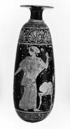 | Keywords: Greek - Alabastron Depcting A Seated Woman and A Woman Walking to the Right Toward a Chair - Walters 48271 - Side B.jpg This red-figure alabastron depicts a woman seated on a diphros in profile to the left juggling three balls She wears a chiton disc earring and fillet On the ground in front sits a kalathos above which a lekythos hangs On the back a woman in a chiton and sakkos stands frontally looking left She holds her left hand up the right is out at her side On the right is a klismos facing left with a mantle bundled on the seat A woman juggling balls or fruit is not an unpopular scene and many exampes are found on lekythoi The balls on this vase are likely to be made of wool as the kalathos suggests although they are apple-shaped ca 480 BC Classical terracotta cm 12 9 4 4 h x max diam ; at rim cm 3 7 diam ; at mouth cm 1 2 diam accession number 48 271 34281 William T / Henry Walters Collection Baltimore date of acquisition unknown by purchase Walters Art Museum Henry Walters Acquired by William T or Henry Walters place of origin Attica Greece Walters Art Museum license Ancient Greek red-figure pottery in the Walters Art Museum Art from Greece Media contributed by the Walters Art Museum needs category review Juggling history |