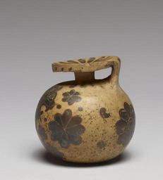 | Keywords: Greek - Aryballos with a Lion - Walters 482095 - Side.jpg Facing to the right on this small aryballos is a lion in profile its mouth open wide surrounded by rosettes of different sizes The lion's facial features mane and musculature are enhanced by extensive incised details Aryballoi were used by athletes to hold oil that was rubbed onto the body before exercise or competition Miller 2004 14-15 They often appear hanging by a small strap from athlete's wrist in gymnasium scenes In addition to this practical function they were also a popular grave good and would have been a suitable votive offering in a hero sanctuary Payne 1931 290E ca 625 BC terracotta cm 6 8 6 67 accession number 48 2095 19507 E S David date and mode of acquisition unknown Walters Art Museum 1957 by purchase Museum purchase 1957 In Search of Ancient Treasure 40 Years of Collecting The Walters Art Gallery Baltimore 1978 Heroes Mortals and Myths in Ancient Greece The Walters Art Museum Baltimore; Frist Center for the Visual Arts Nashville; San Diego Museum Of Art San Diego; Alexander S Onassis Public Benefit Foundation USA New York 2009-2011 place of origin Corinth Greece Walters Art Museum license Ancient Greek black-figure pottery in the Walters Art Museum Media contributed by the Walters Art Museum needs category review Ancient Greek pottery aryballoi Corinthian black-figure pottery |