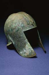 | Keywords: Greek - Assemblage from a Warrior's Burial - Walters 542456 - Three Quarter.jpg This helmet with a mask separate nose piece band ring and plaque were found with other bronze armor in a tomb in northern Greece The helmet cast with beaded and incised edges is of a type possibly developed in the Peloponnese in the 7th century BC and later used in Illyria a region northwest of Greece and other foreign lands The other objects are made of hammered sheet gold century 6 BC Archaic bronze cm 24 19 25 accession number 54 2456 14843 Tomb in Chalkidike Northern Greece Hesperia Art Philadelphia Walters Art Museum 1964 by purchase Museum purchase with funds provided by the S A P Fund 1964 place of origin Thrace in present-day Chalcidice Greece Walters Art Museum license Ancient Greek art in the Walters Art Museum Armour in the Walters Art Museum Art from Greece Ancient Greek helmets Bronze armour |