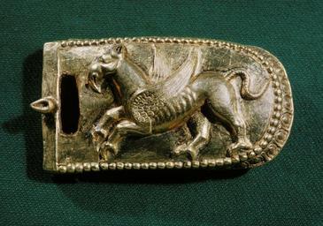 | Keywords: Greek - Belt Buckle with Griffin - Walters 57373.jpg This buckle is worked in repoussé and engraved It has a slot and knob that fastened a belt century 1 BC Greco-Roman gold cm 6 6 3 6 accession number 57 373 31894 Said to be from a tomb near Olbia Parutino Ukraine Peter Mavrogordato date and mode of acquisition unknown F L van Gans Frankfurt date and mode of acquisition unknown Galerie Bachstitz The Hague Henry Walters city Baltimore Walters Art Museum Henry Walters Acquired by Henry Walters 1921 Jewelry - Ancient to Modern The Walters Art Gallery Baltimore 1979-1980 place of origin Pontos in present-day Turkey Walters Art Museum license Ancient Greek art in the Walters Art Museum Jewellery in the Walters Art Museum Art from Greece Reliefs of griffins Media contributed by the Walters Art Museum needs artist review Ancient Greek jewellery of Olbia Olbia Ukraine |