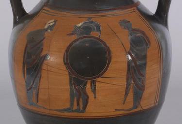 | Keywords: Greek - Black-Figure Amphora - Walters 4813 - Detail A.jpg This vase may portray the common departure scene of two warriors in full armor leaving home for war or it may represent a famous scene from The Iliad in which Priam king of Troy comes to claim and pay ransom for the body of his son Hector Achilles who killed Hector in single combat greets the elderly king Witnessing this scene are a second warrior who stands next to Achilles and another man standing behind ca 520 510 BC Archaic terracotta cm 32 3 20 5 accession number 48 13 10431 Don Marcello Massarenti Collection Rome no 231 Henry Walters city Baltimore Walters Art Museum Henry Walters Acquired by Henry Walters with the Massarenti Collection 1902 place of origin Athens Greece Walters Art Museum license Ancient Greek black-figure pottery in the Walters Art Museum Achilles in ancient Greek pottery Ransom of Hector Media contributed by the Walters Art Museum needs category review Priam in ancient Greek pottery |