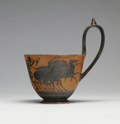 | Keywords: Greek - Black-figure Kyathos - Walters 48219 - Side B.jpg This kyathos depicts a characteristic battle scene two warriors or heroes fighting over a fallen soldier Two bearded soldiers attack each other with raised spears and large shields decorated with white motifs and red rims Their swords hang sheathed at their side The warrior on the left has knocked his opponent's helmet off his head while his opponent's spear is pointing at his throat In between a third warrior has collapsed on his right knee and uses his spear and shield for support Unlike the standing fighters in their short skirts he wears a short white garment belted with a bow On either side of this central scene a warrior with a shield is driving to the right in a quadriga a four-horse chariot Without identifying attributes or inscriptions the warriors depicted could be ordinary soldiers in battle or Greek heroes fighting at Troy The scene of two warriors fighting over the body of a fallen soldier is a familiar episode from accounts of the Trojan War; the recovery of the body and the armor of a dead comrade was crucial Even if the warriors depicted on this vessel are ordinary Greeks the imagery recalls the glory of the heroic warriors of the past ca 510 BC Archaic terracotta H with handle 5 11/16 x W with handle 5 3/8 in 14 4 x 13 6 cm ; H to rim 3 3/16 x Diam 4 1/8 in 8 1 x 10 4 cm accession number 48 219 7599 Ercole Canessa date and mode of acquisition unknown Sale Galerie Georges Petit 1921 no 36 Sale American Art Galleries 1924 no 52 Dikran Kelekian New York and Paris date and mode of acquisition unknown Henry Walters Baltimore date of acquisition unknown by purchase Walters Art Museum Henry Walters Acquired by Henry Walters Heroes Mortals and Myths in Ancient Greece The Walters Art Museum Baltimore; Frist Center for the Visual Arts Nashville; San Diego Museum Of Art San Diego; Alexander S Onassis Public Benefit Foundation USA New York 2009-2011 place of origin Attica Greece Walters Art Museum license Ancient Greek black-figure pottery in the Walters Art Museum Quadriga Horses in ancient Greek pottery Ancient Greek kyathoi Art from Greece |