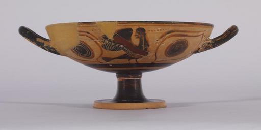 | Keywords: Greek - Black-figure Kylix with Sirens - Walters 4837 - Side B.jpg Homer does not describe the physical appearance of the Sirens but their tantalizing beauty and alluring song captured the interest of commentators throughout antiquity The Sirens are depicted as composite creatures as early as the 8th century BC a motif perhaps derived from Egyptian sources The earliest types such as those seen here are shown simply with women's heads and birds' bodies without arms or hands Sirens occur not only in narrative scenes with Odysseus and his men but also as decorative motifs as do sphinxes ; during the Classical period they come to have associations with funerary iconography The two-handled vase shown here is a type of kylix known as an eye cup which would resemble a mask when raised to the lips during the symposium The simple black-slip interior reveals several small holes around the handles that were used for repairs in antiquity On the exterior a similar composition dominates each side of the vase in a single band Between two large eyes stands a siren; on one side the siren faces frontally to the right on the other side she turns her head looking back Their full wings are simply drawn with bands of added red pigment Beneath their feet runs a simple ground line of black glaze Above each siren are traces of an inscription perhaps the signature of the potter or painter though it is no longer readable century 6 BC terracotta H 4 1/2 x W 11 13/16 x Diam at rim 9 1/16 in 11 5 x 30 x 23 cm accession number 48 37 16991 Don Marcello Massarenti Collection Rome before 1897 mode of acquisition unknown Henry Walters city Baltimore Walters Art Museum Henry Walters Acquired by Henry Walters with the Massarenti Collection 1902 Things With Wings Mythological Figures in Ancient Greek Art The Walters Art Museum Baltimore 2005-2006 Things With Wings Mythological Figures in Ancient Greek Art Ward Museum Salisbury 2009 Heroes Mortals and Myths in Ancient Greece The Walters Art Museum Baltimore; Frist Center for the Visual Arts Nashville; San Diego Museum Of Art San Diego; Alexander S Onassis Public Benefit Foundation USA New York 2009-2011 place of origin Attica Greece Walters Art Museum license Eye-cups Ancient Greek black-figure pottery in the Walters Art Museum Art from Greece Sirens in ancient Greek art Media contributed by the Walters Art Museum needs category review |