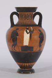 | Keywords: Greek - Black-figure Pseudo-Panathenaic Amphora - Walters 482107 - Side B.jpg The image on the obverse of this amphora may represent the mousikoi agones or musical competitions of the Panathenaic festival Bundrick 2005 160-74 In the center of the scene a bearded man clad in an ankle-length white chiton stands on a bema or podium Facing right he holds a large seven-stringed kithara in this left hand With his right hand he plays the instrument using a plectrum attached by a string The kithara's cover hangs below Added white paint has been applied to the arms of the elaborate kithara to simulate ivory One man stands on either side of the bema perhaps representing spectators trainers or judges of the competition The kithara was a highly esteemed instrument in Archaic Greece and both Apollo and Orpheus were mythological models for human performers Shapiro 1992 69 Herodotus 1 23-24 reports the story of Arion a highly regarded and successful kitharode who was thrown overboard from a ship by men who conspired to rob him According to the tale Arion was saved by a dolphin and returned to shore unharmed which suggests that kitharodes were believed to have enjoyed the patronage of Apollo The image on this vase finds a heroic counterpart in the representation of Herakles Mousikos in which the hero appears as the performer often with Olympic deities as spectators On the amphora's obverse Athena strides to the left wearing her characteristic helmet and scaly aegis The goddess wields a spear and holds a large shield decorated with a soaring eagle Two Doric columns each with a rooster perched on top flank the goddess This is the standard configuration for one side of the Panathenaic amphora which was given as a prize at the quadrennial games in honor of the patron goddess of Athens However the size of this vase and the lack of an inscription indicate that it was not actually used as a prize ca 500 485 BC terracotta cm 44 26 9 accession number 48 2107 3696 William Randoph Hearst San Simeon date and mode of acquisition unknown Garrett Chatfield Pier Sale Anderson Galleries 1958 Walters Art Museum 1958 by purchase Museum purchase 1958 Heroes Mortals and Myths in Ancient Greece The Walters Art Museum Baltimore; Frist Center for the Visual Arts Nashville; San Diego Museum Of Art San Diego; Alexander S Onassis Public Benefit Foundation USA New York 2009-2011 place of origin Attica Greece Walters Art Museum license Ancient Greek black-figure pottery in the Walters Art Museum Art from Greece Pseudo-Panathenaic amphoras Citharas Chiton |