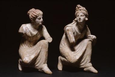 | Keywords: Greek - Crouching Women Playing Knucklebones - Walters 48303, 48304 - Group.jpg The maidens are playing an ancient form of jacks known as astragalus knucklebones a game in which five small animal bones were tossed into the air and caught on the back of the hand The grouping of separate statuettes is almost unknown before Hellenistic times when artists became fascinated both by the interaction of figures and by the challenge of representing complex poses such as this crouching stance ca 330 100 BC Hellenistic terracotta cm 14 5 10 7 6 7 accession number 48 303 48 304 77404 Hirsch Sale June 30-July 2 1921 no 132 Arthur Sambon Paris 1924 Henry Walters city Baltimore Walters Art Museum Henry Walters Acquired by Henry Walters 1924 place of origin Greece Walters Art Museum license Ancient Greek sculptures in the Walters Art Museum Art from Greece Media contributed by the Walters Art Museum needs category review Knucklebones in art |