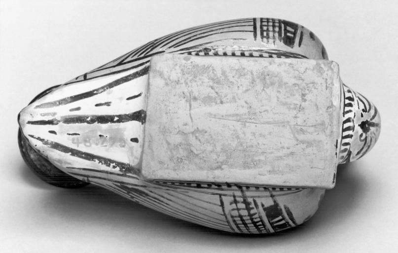 Keywords: Greek - Duck Askos - Walters 48270 - Bottom.jpg This askos has a flaring rim that is painted black It's neck has a concave profile and is black inside It has a single strap handle The body is in the shape of a duck with a flat base and an underside in reserve with traces of miltos The wings are in reserve with details in black The underside of the tail head and breast are white-ground with black for the details A palmette with volutes beneath the bill and an interrupted cross star is above to either side A row of lines in a debased tongue pattern between sets of parallel black lines runs around the front of the base and the two sides Palmettes decorate the bows of the wings and the back of the duck late 5th century BC Classical terracotta cm 6 9 6 2 11 1 h x max w x l accession number 48 270 31793 Henry Walters Baltimore date of acquisition unknown by purchase purchased in Athens but acquired sometime later by Henry Walters Walters Art Museum Henry Walters Acquired by Henry Walters place of origin Attica Greece Walters Art Museum license Ancient Greek red-figure pottery in the Walters Art Museum Ancient Greek askoi Media contributed by the Walters Art Museum needs category review |
