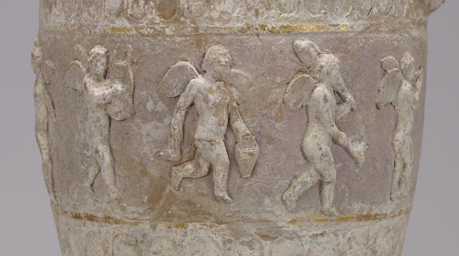 | Keywords: Greek - Erotes & Acanthus - Walters 48117 - Detail A.jpg This vase is a superb example from a rare group of ornate vessels Their undecorated backs suggest they were intended for display within a niche The Eros figures carry the attributes of Dionysus including torches a pail and a lyre The use of color the tall narrow proportions and the elongated finial with floral tip on the lid are characteristic of South Italian work between 225 200 BC Hellenistic terracotta cm 59 25 ; cm 17 max diam accession number 48 117 15596 Don Marcello Massarenti Collection Rome date and mode of acquisition unknown cat no 246 Henry Walters city Baltimore Walters Art Museum Henry Walters Acquired by Henry Walters with the Massarenti Collection 1902 From Alexander to Cleopatra Greek Art of the Hellenistic Age The Walters Art Gallery Baltimore 1988-1989 place of origin Athens Greece Walters Art Museum license Ancient Greek pottery in the Walters Art Museum Art from Greece Media contributed by the Walters Art Museum needs category review |