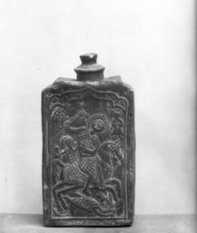 | Keywords: Greek - Flask with an Image of Saint George Killing the Dragon - Walters 551.jpg Such lead silver or tin flasks for brandy were manufactured in large quantities for Christians in the late Ottoman Empire The saints depicted on them were meant to protect the owner Images of Saint George were particularly popular Here the saint's name is accompanied by the abbreviation IC XC Jesus Christ the name Joseph probably the owner's and on the other side above the head of the irder seated behind St George the word Hadji meaning for Christians one who has made a pilgrimage to Jerusalem century 18 Modern lead cm 18 8 9 8 accession number 55 1 7787 Dikran Kelekian New York and Paris date and mode of acquisition unknown Henry Walters city Baltimore Walters Art Museum Henry Walters Acquired by Henry Walters 1912 place of origin Balkan Peninsula Walters Art Museum license Medieval art in the Walters Art Museum Art from Greece Reliefs of Saint George and the Dragon Media contributed by the Walters Art Museum needs category review |