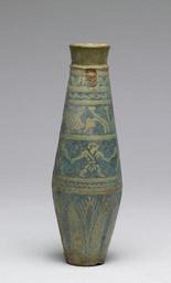 | Keywords: Greek - Flask with Figures and Lotus - Walters 48370 - View A.jpg Made by Greek artisans in the flourishing Hellenic trading colony of Naucratis in Egypt's delta this flask's low relief decoration and darker shade of glaze in the background are characteristic of faience ware produced here The shape of the vessel the frieze of men running and the lotus pattern were inspired by traditional Egyptian motifs century 3 2 BC Hellenistic-Ptolemaic Egyptian faience cm 16 6 5 5 h x diam accession number 48 370 16532 Dikran Kelekian Paris and New York Henry Walters city Baltimore Walters Art Museum Henry Walters Acquired by Henry Walters 1924 From Alexander to Cleopatra Greek Art of the Hellenistic Age The Walters Art Gallery Baltimore 1988-1989 place of origin Naucratis present-day Kom Gieif Egypt Walters Art Museum license Ancient Egyptian pottery in the Walters Art Museum Ancient Greek pottery in the Walters Art Museum Art from Greece Media contributed by the Walters Art Museum needs category review |