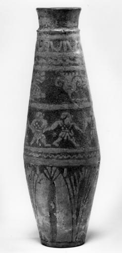 | Keywords: Greek - Flask with Figures and Lotus - Walters 48370 - Profile.jpg Made by Greek artisans in the flourishing Hellenic trading colony of Naucratis in Egypt's delta this flask's low relief decoration and darker shade of glaze in the background are characteristic of faience ware produced here The shape of the vessel the frieze of men running and the lotus pattern were inspired by traditional Egyptian motifs century 3 2 BC Hellenistic-Ptolemaic Egyptian faience cm 16 6 5 5 h x diam accession number 48 370 16532 Dikran Kelekian Paris and New York Henry Walters city Baltimore Walters Art Museum Henry Walters Acquired by Henry Walters 1924 From Alexander to Cleopatra Greek Art of the Hellenistic Age The Walters Art Gallery Baltimore 1988-1989 place of origin Naucratis present-day Kom Gieif Egypt Walters Art Museum license Ancient Egyptian pottery in the Walters Art Museum Ancient Greek pottery in the Walters Art Museum Art from Greece Media contributed by the Walters Art Museum needs category review |