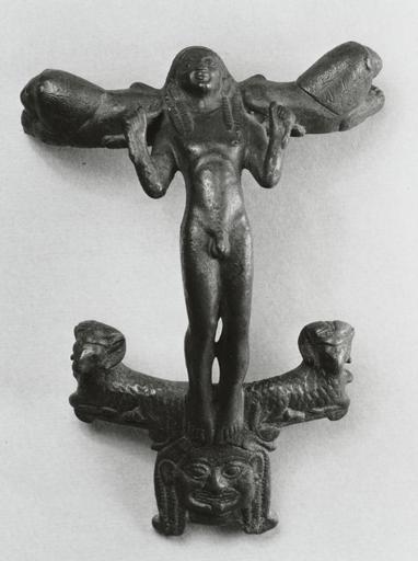 Keywords: Greek - Handle in the Form of a Man Holding Lions - Walters 54912.jpg This handle in the form of a nude male athlete was part of a metal oinochoe or jug with a trefoil mouth many of which were manufactured in the Peloponnese renowned for its metallurgists A nude male is holding the tails of two lionesses which were attached on the lip of the vessel while trampling a gorgoneion the head of the Medusa who turned whoever looked at her face into stone His domination over the lions suggests that he is a deity perhaps the god Apollo between 550 500 BC Archaic bronze cm 15 11 6 9 1 accession number 54 912 25595 Carmichael Sale London 1926 no 330 Joseph Brummer Henry Walters city Baltimore Walters Art Museum Henry Walters Acquired by Henry Walters 1927 place of origin Corinth Greece Walters Art Museum license Ancient Greek art in the Walters Art Museum Art from Greece Media contributed by the Walters Art Museum needs category review |