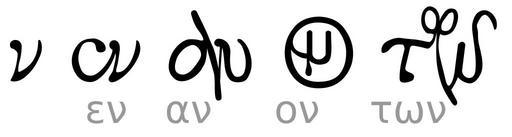 | Keywords: Greek minuscule Nu with ligatures.svg en Samples of ligatures involving Greek letter Nu in medieval minuscule handwriting and early modern printing own based on glyphs in the Rgreekl2 font made by Vernon Kooy http //schmidhauser us/tools/rgl/rgreekl2 pdf Fut Perf 2010-08-14 Nu letter Greek ligatures ν |