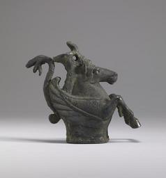 | Keywords: Greek - Pegasos Ornament from a Chariot - Walters 54882 - Right Side.jpg This ornament of the foreparts of the winged-horse Pegasos decorated a pole that would have connected a chariot to a horse Careful modeling and incised decoration create a detailed representation of this mythical creature that signified speed A coiled snake rears up behind Pegasos' head early 5th century BC Archaic bronze cm 10 3 3 11 accession number 54 882 32266 Henry Walters Baltimore date of acquisition unknown by purchase Walters Art Museum Henry Walters Acquired by Henry Walters Things With Wings Mythological Figures in Ancient Greek Art Ward Museum Salisbury 2009 Heroes Mortals and Myths in Ancient Greece The Walters Art Museum Baltimore; Frist Center for the Visual Arts Nashville; San Diego Museum Of Art San Diego; Alexander S Onassis Public Benefit Foundation USA New York 2009-2011 place of origin Greece Walters Art Museum license Ancient Greek art in the Walters Art Museum Art from Greece Media contributed by the Walters Art Museum needs category review Pegasus statues |
